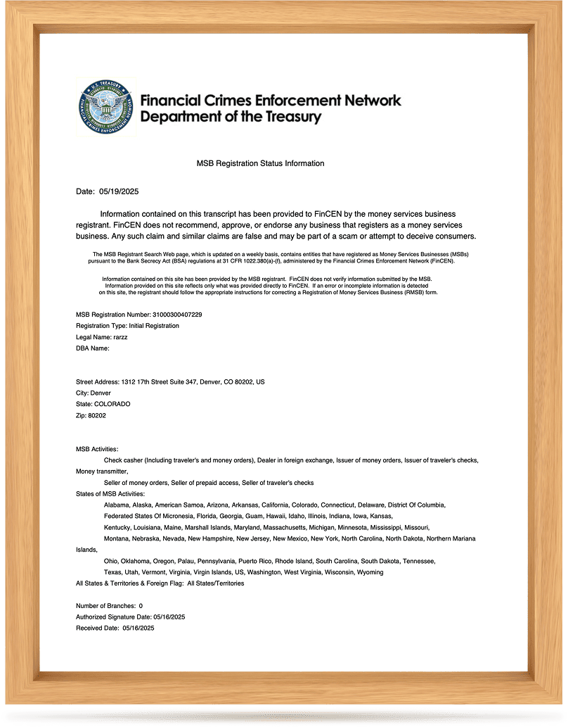The platform's operating entity has obtained the MSB (Money Services Business) financial service license issued by the U.S. FinCEN, possessing the legal compliance qualifications to provide digital asset management, transaction matching, and NFT financial services.